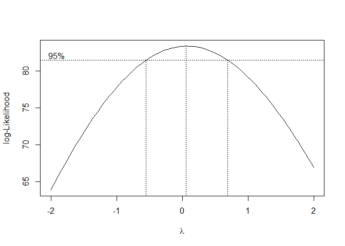 I try a Box-Cox transformation to stabilize the variance/seasonal effect and to make the data more normally distributed. Because λ = 0 is within the 95% Confidence interval of the Box-Cox transformation, we use a log-transformation on the original data. We can see that the variance is no longer increasing with time and the data is more normally distributed.