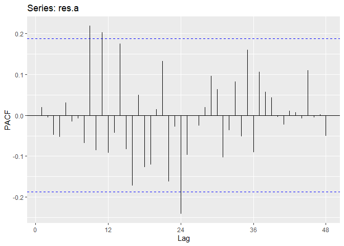 ggAcf(res.a,lag.max = 48);ggPacf(res.a,lag.max=48)