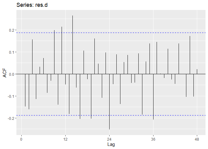## ar(x = res.d, aic = TRUE, order.max = NULL, method = c("yule-walker"))