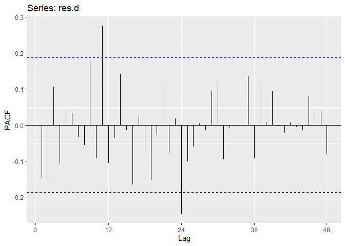 ggAcf(res.d,lag.max = 48);ggPacf(res.d,lag.max=48)