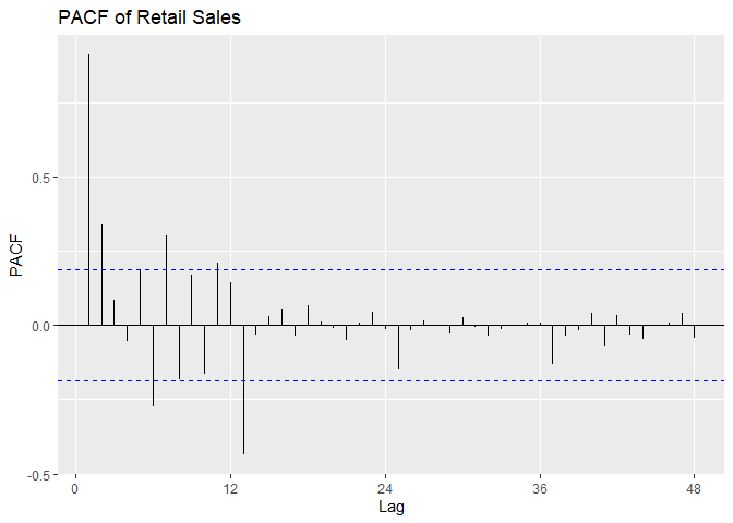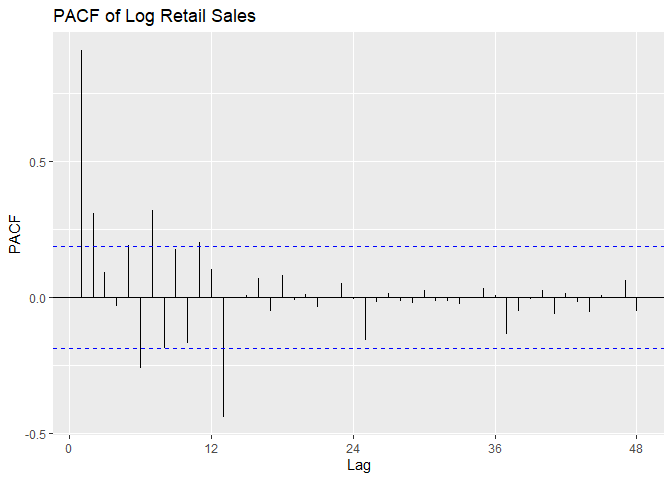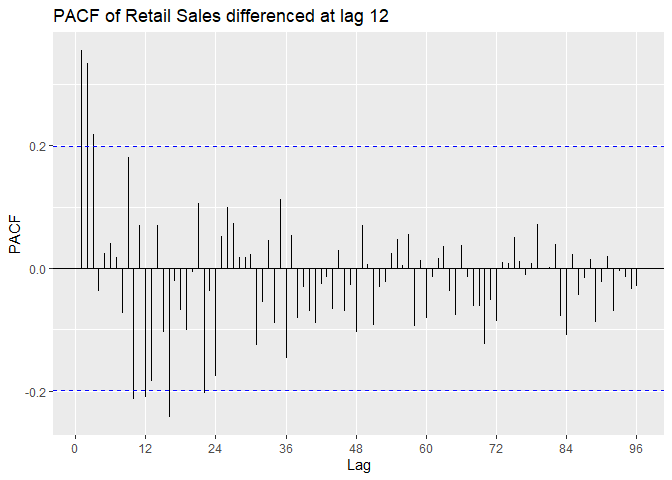 ggtitle('PACF of Log Retail Sales differenced at lag 12')