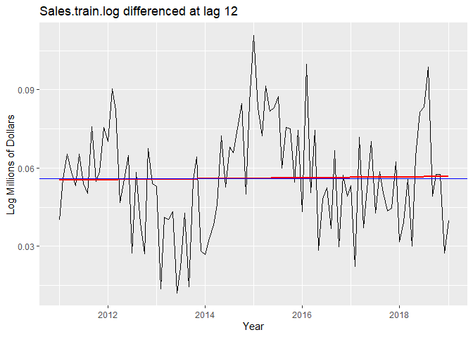 # Differencing Sales.train.log again at lag 12 and lag 1 to remove trend