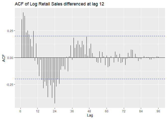 ggtitle('ACF of Log Retail Sales differenced at lag 12')