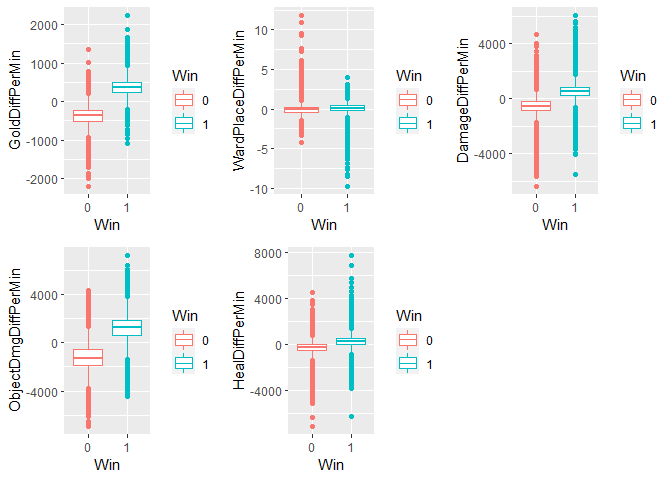 I have created the boxplots of the response variable Win vs the continuous predictors to get infer their relationships to the response. From the boxplots it appears that GoldDiffPerMin and ObjectDmgDiffPerMin are usually higher for winning teams.