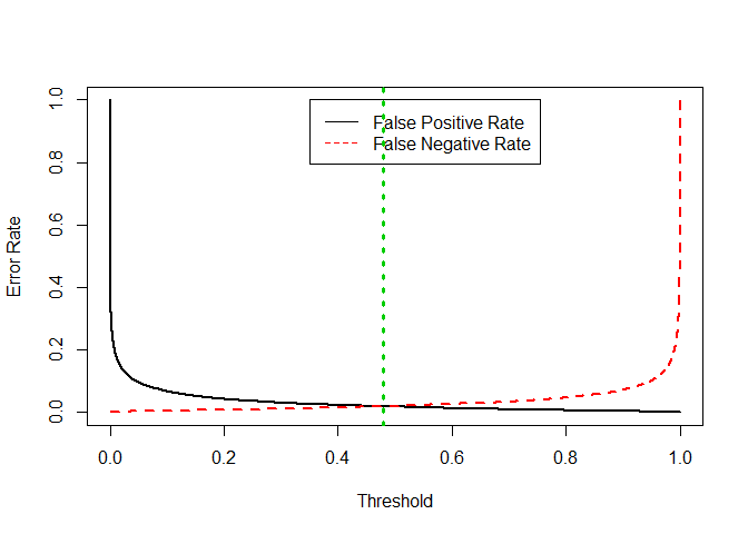 Using the randomForest() function, I fit a Random Forest model to my training data. We can see that the OOB estimate of error rate is 1.48%, which is a small improvement over the Logistic Regression validation error rate of 1.51%, and indicates that our model should not overfit and should generalize well to real data. The False Negative rate is 1.47% while the False Positive rate is 1.49%.