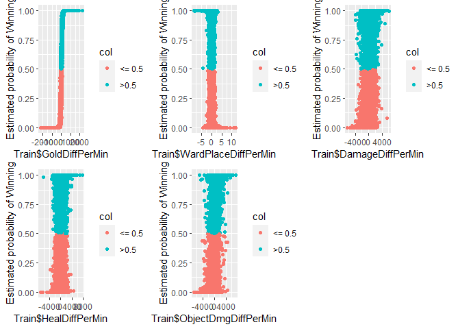 First I plotted the predictors versus the estimated probabilities of the training data. It appears that past a positive threshold value of GoldDiffPerMin, the estimated probability is always about 1. For the other predictors, demonstrating that it is indeed a well-separated class. WardPlaceDiffPerMin is similar except past a positive threeshold value, the estimated probability of winning is 0.