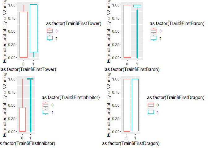 In general, the estimated probability of winning is slightly higher for the teams that capture the First Baron, First Tower, and First Inhibitor.